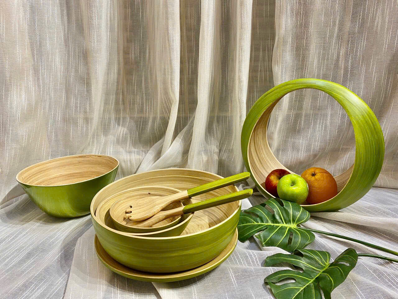 Một lẵng hoa quả tre cuốn màu xanh lá cây dịu sẽ trở thành điểm nhấn tự nhiên cho bàn trà.