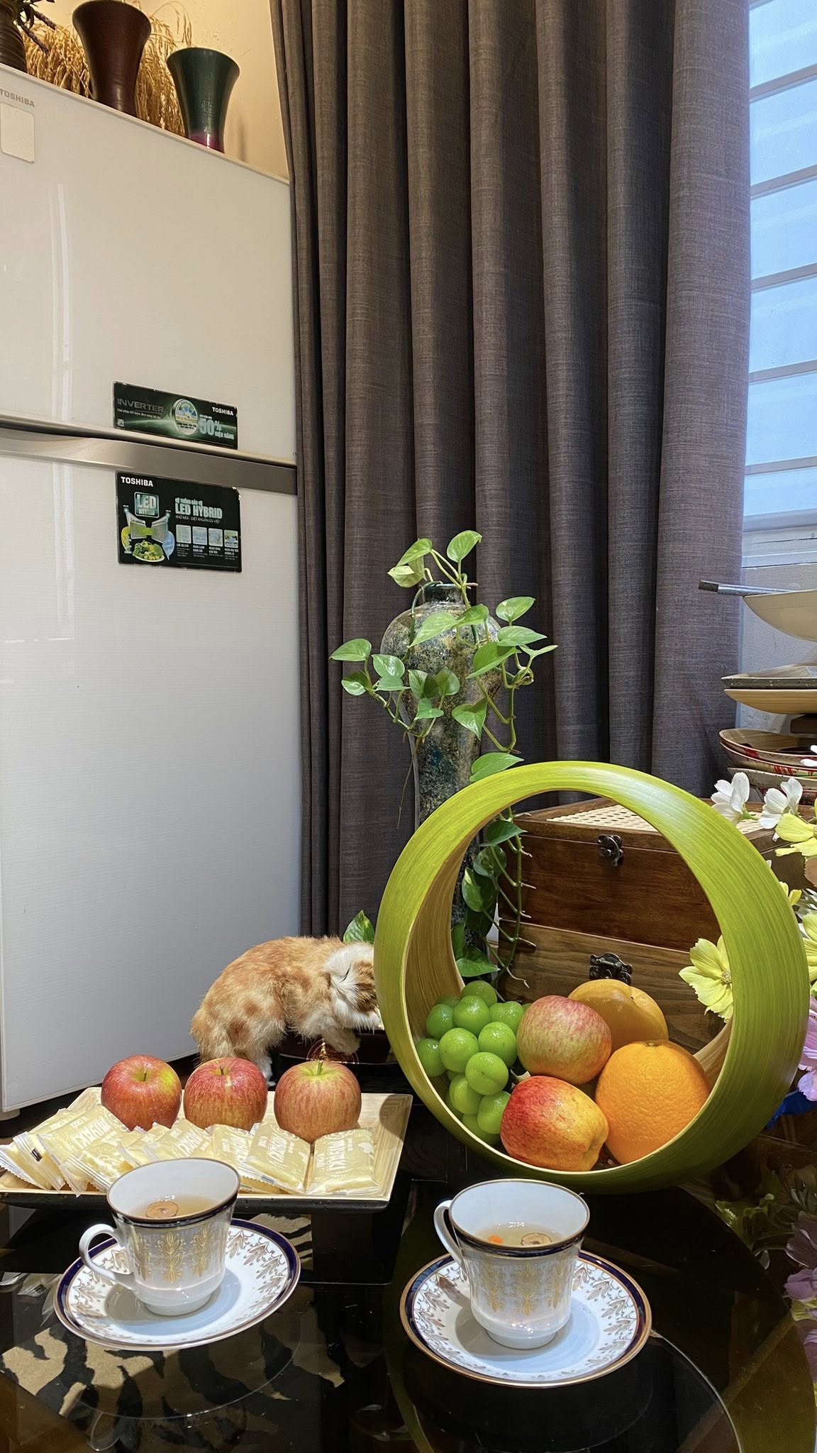 Chỉ với lẵng hoa quả tre cuốn màu xanh lá dịu, khay tre cuốn đặt bánh ngọt và hai tách trà, thêm chú mèo nhỏ đang ngủ lười bên cửa sổ, bạn đã có thể tạo nên một góc bàn trà nhẹ nhàng, thơ mộng và rất “chill”.
